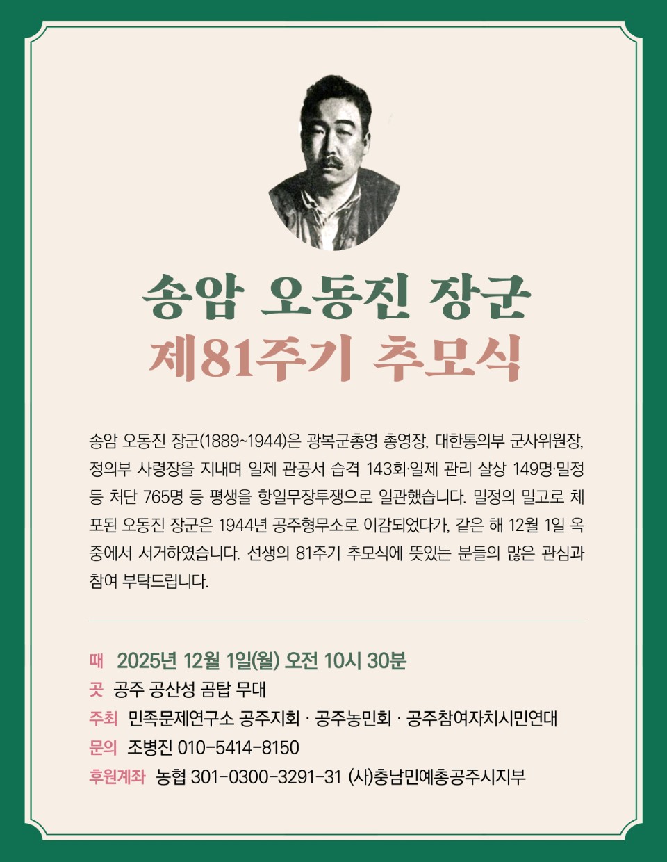 [공주참여자치시민연대] 공주참여연대, 공주시농민회, 민족문제연구소 공주지회 공동주최로 조선독립군 총사령 송암 오동진 장군 추모식이 열리니 많은 참석을 부탁합니다.